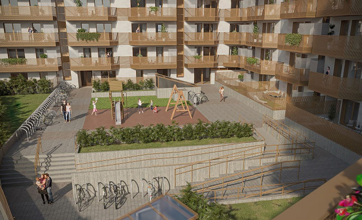 La promoción se compone de 120 viviendas en un edificio moderno de bonito diseño y cuidados materiales con seis portales en una urbanización cerrada. La promoción dispondrá de zonas ajardinadas, zona de juegos infantiles, guarda bicis, sala gourmet y gimnasio equipado.